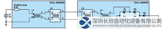 两个EVAL-ADIN11X0EBZ板用于向系统添加PoDL功能,其中一个板用于媒介转换器,另一个用于EVAL-ADIN1110EBZ。该板是一个插件模块,可以安装在评估板的MDI原型接头上,并且可以配置为通过数据线提供和接收电力。
